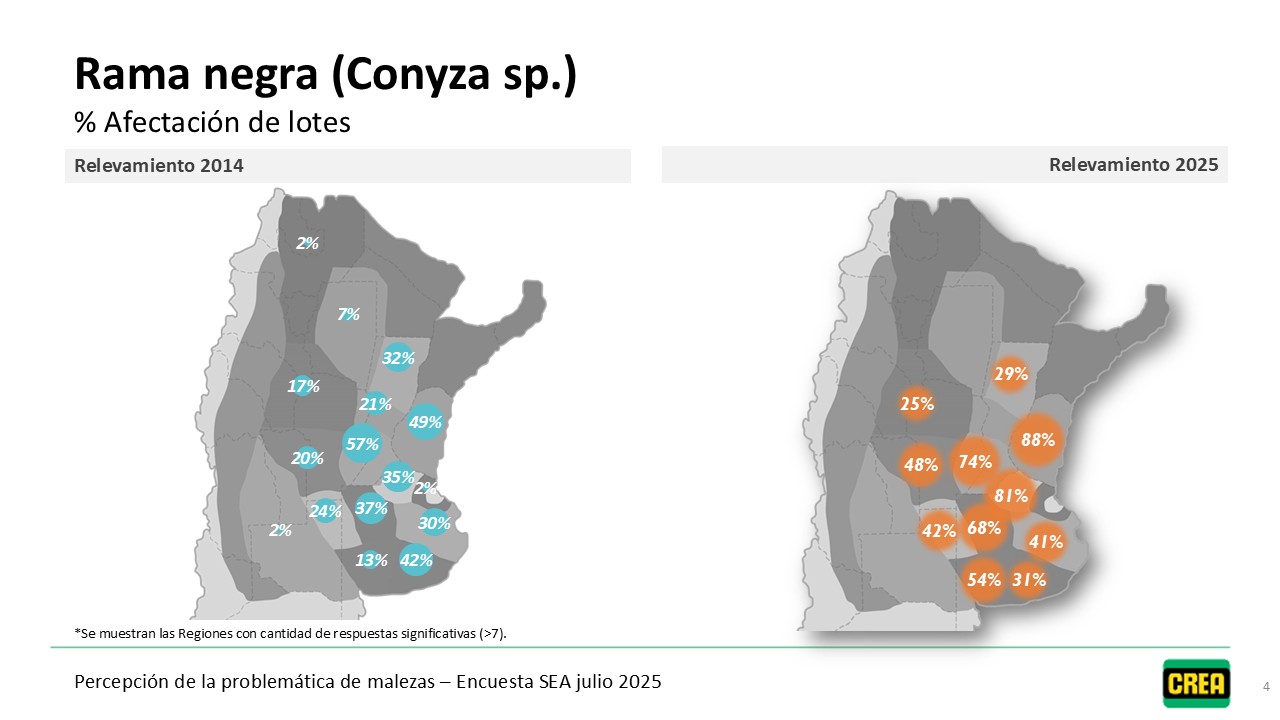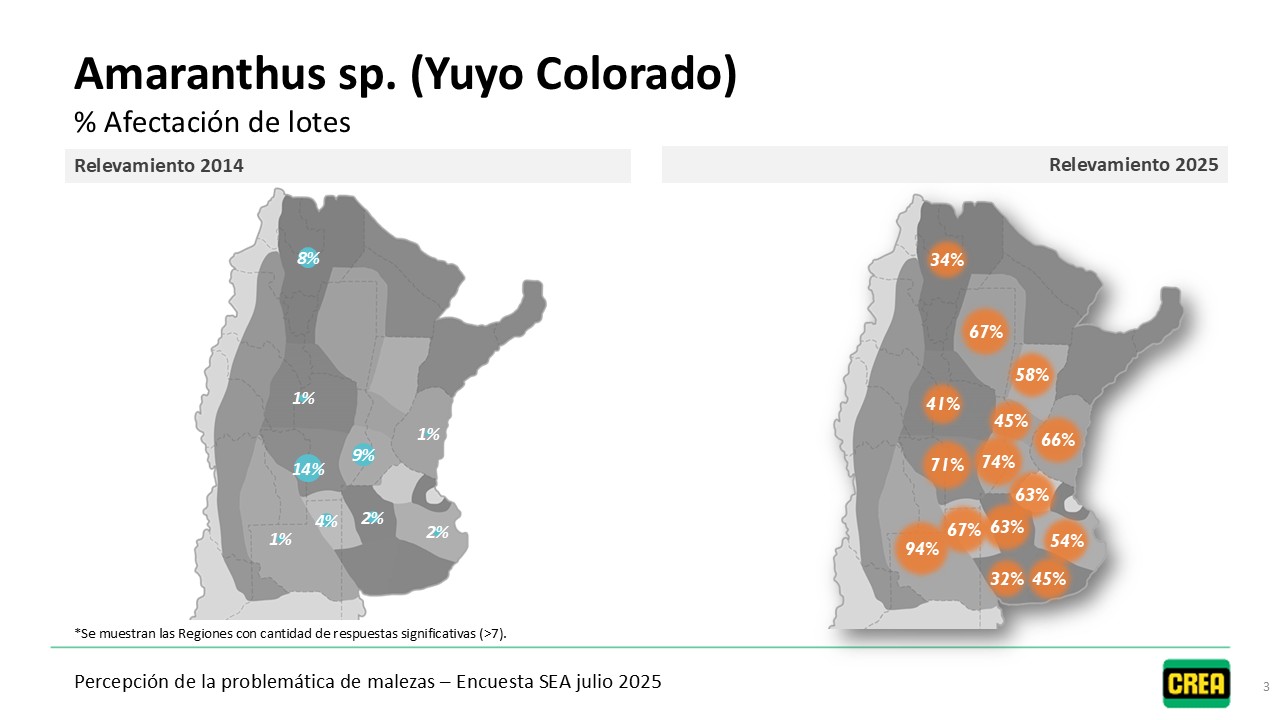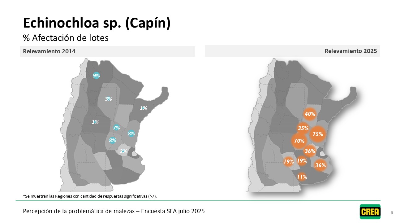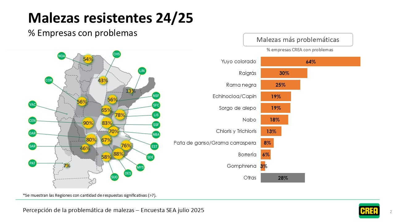 Desde 2014, anualmente, se releva la percepción de los Empresarios y Técnicos CREA sobre el problema de malezas en los sistemas agrícolas. Dicho relevamiento se hace a través de la encuesta SEA (Sistema de Encuestas Agropecuarias). A partir de estos datos elaboramos mapas que muestran el estado actual y la evolución del problema de malezas y el impacto sobre las empresas CREA de las distintas regiones.
